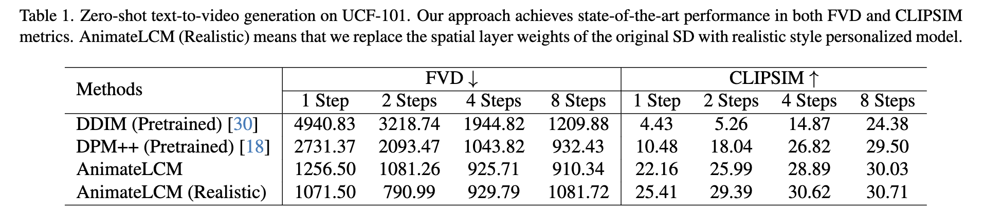 在UCF-101数据集上的零样本文本到视频生成任务中,AnimateLCM在FVD和CLIPSIM指标上均取得了最佳性能。