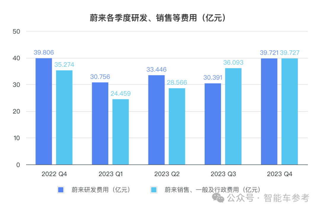 Q4蔚来在研发费用方面花了39.721亿元,和去年同期基本持平,比上一季度增加30.7%;同时销售等费用也同比增加12.6%,达到39.727亿元