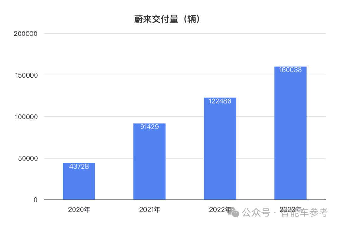 2023年度,蔚来的交付量,总营收都是成立以来的最好成绩。年度交付量首次超16万辆,为160038辆,比去年增加30.6%,每天能交付454辆
