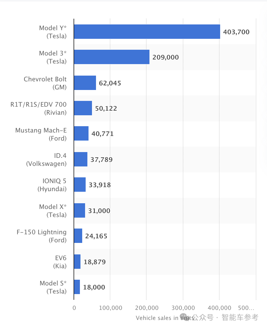 并且在2023年美国最畅销纯电车排行榜中,一款宝马的车都没有,而都是特斯拉、雪佛兰、Rivian这些满足宝马“百亿补贴”条件的产品。(来源:Statista)