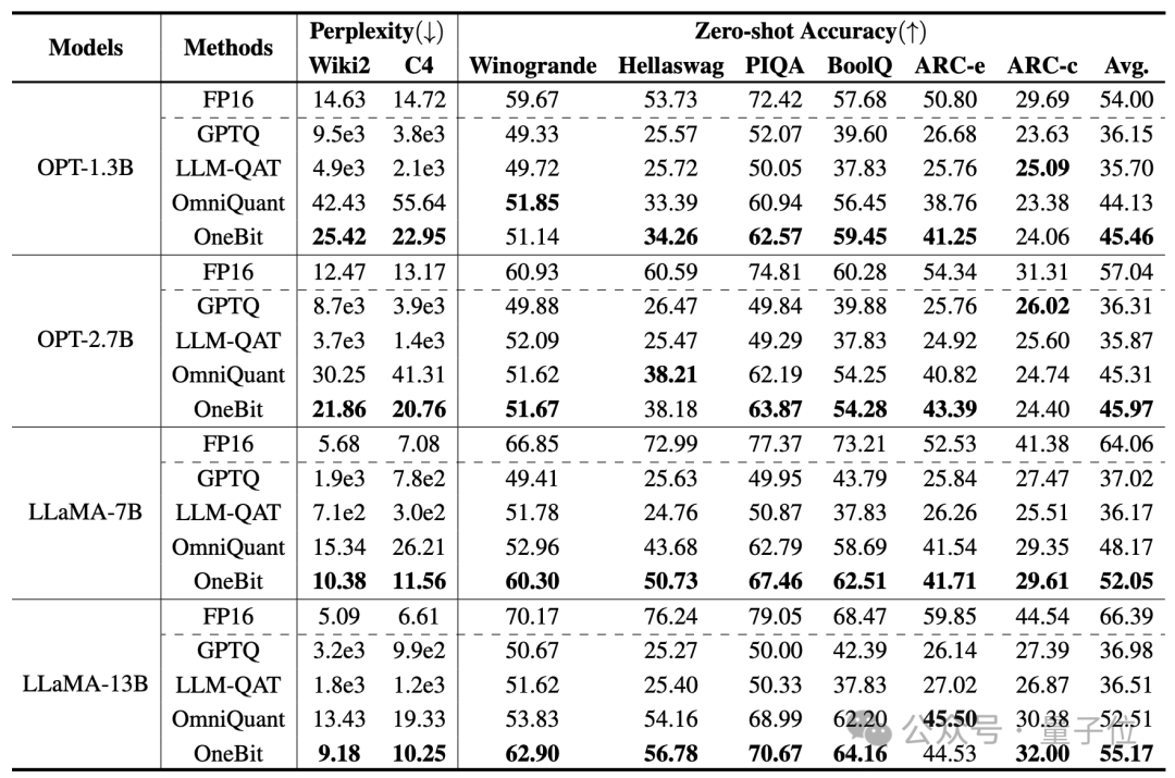 由于目前还没有1bit权重量化的研究,作者只对OneBit框架使用1bit权重量化,而对其他方法采取2bit量化设置。