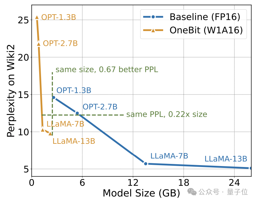 随着模型规模增大,OneBit量化模型降低的困惑度比FP16模型降低的困惑度要多。