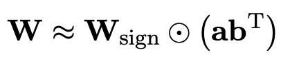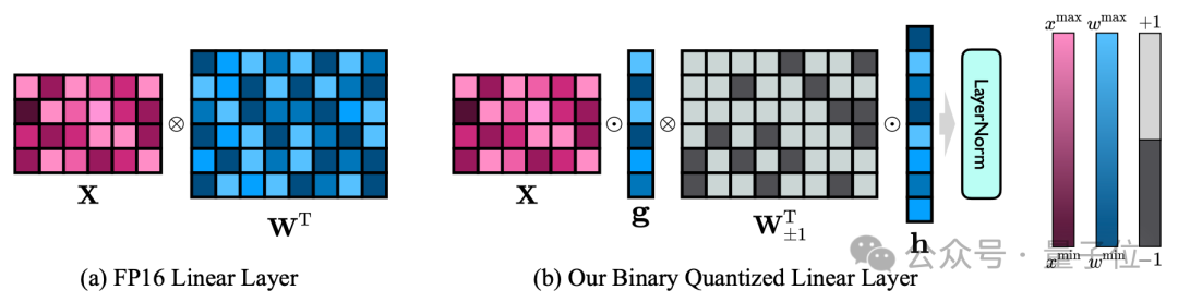 从上图可以看出,只有值向量g和h保持FP16格式,而权重矩阵则全部由±1组成。