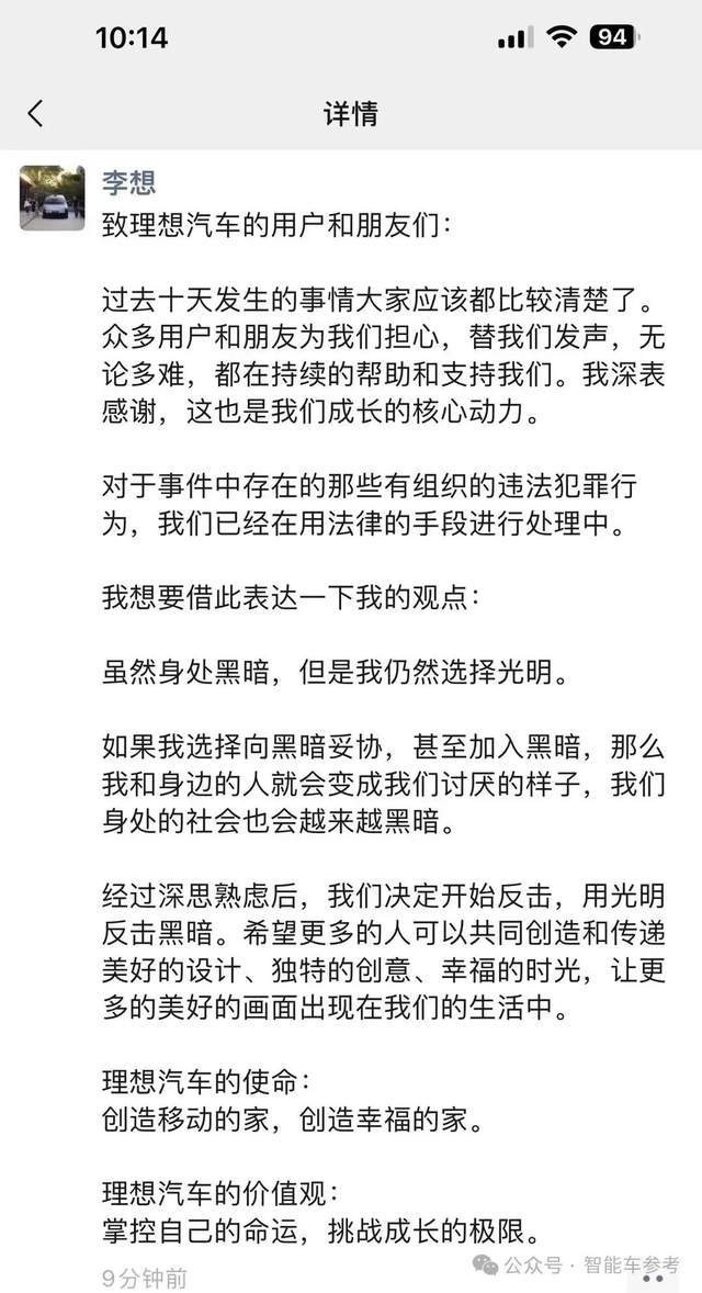 李想的脾气性格,定不会忍气吞声。“不与黑暗同流合污”,他要表达的意思是,理想不会在水面下搞“黑公关”再骂回去,而是直接打官司起诉。