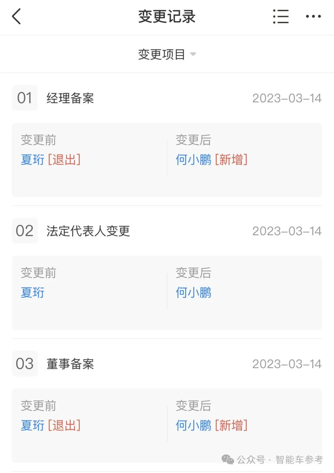 先是夏珩辞去执行董事职务,后卸任多家小鹏汽车相关公司董事、法人和经理职位,多个职位由何小鹏接任。