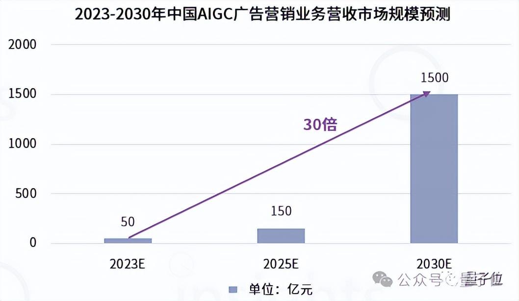 量子位智库《中国AIGC广告营销产业全景报告》给出预判,2030年,生成式AI在广告营销行业中业务营收预计达到千亿级市场规模。