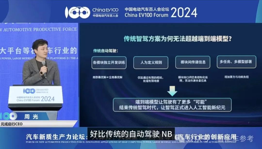 在论坛上,周光还强调了“端到端”相比传统智驾方案的优越性。