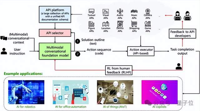 • 能够通过使用基础大模型作为核心系统,首先理解不同类型的多模态输入(如文本、图像、视频、音频和代码),然后生成调用API完成任务的代码,来执行各种数字和物理任务。