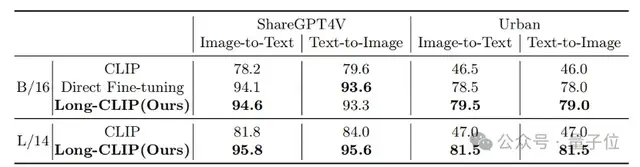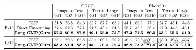 无论是在传统的短文本检索(COCO、Flickr30k),还是在长文本检索任务上,Long-CLIP在召回率上均有显著提升。