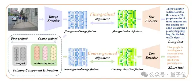 具体而言,研究者们利用主成分分析(PCA)算法,从细粒度的图像特征中提取核心属性,将其余属性过滤后重建粗粒度图像特征,并将其与概括性的短文本进行对齐。这一策略既要求模型不仅能够包含更多的细节(细粒度对齐),同时还能识别并建模其中最为核心的属性(核心成分提取与粗粒度对齐)。