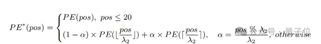 基于以上观察,研究者保留了前20个位置编码,而对于剩下的57个位置编码,则以一个更大的比率λ2 进行插值,计算公式可表示为: