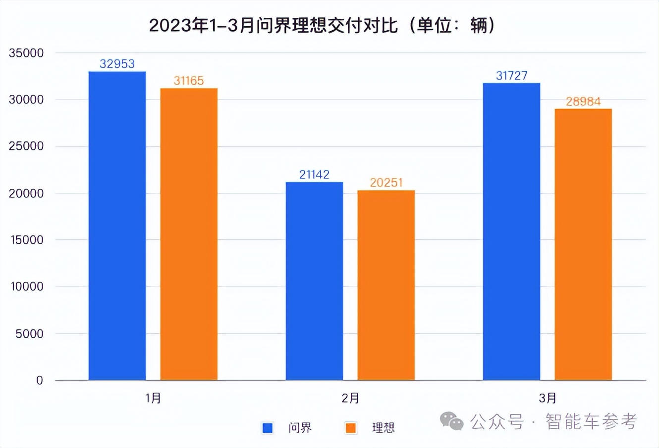 而3月份,理想的交付量是28984台,问界则为31727辆,双方差距扩大至近三千台。