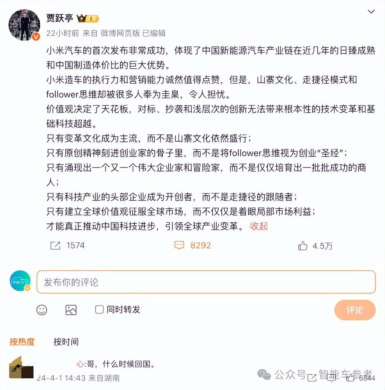 上个月才指责完高合“剽窃”的贾跃亭,这个月又跳出来,对小米开炮:
