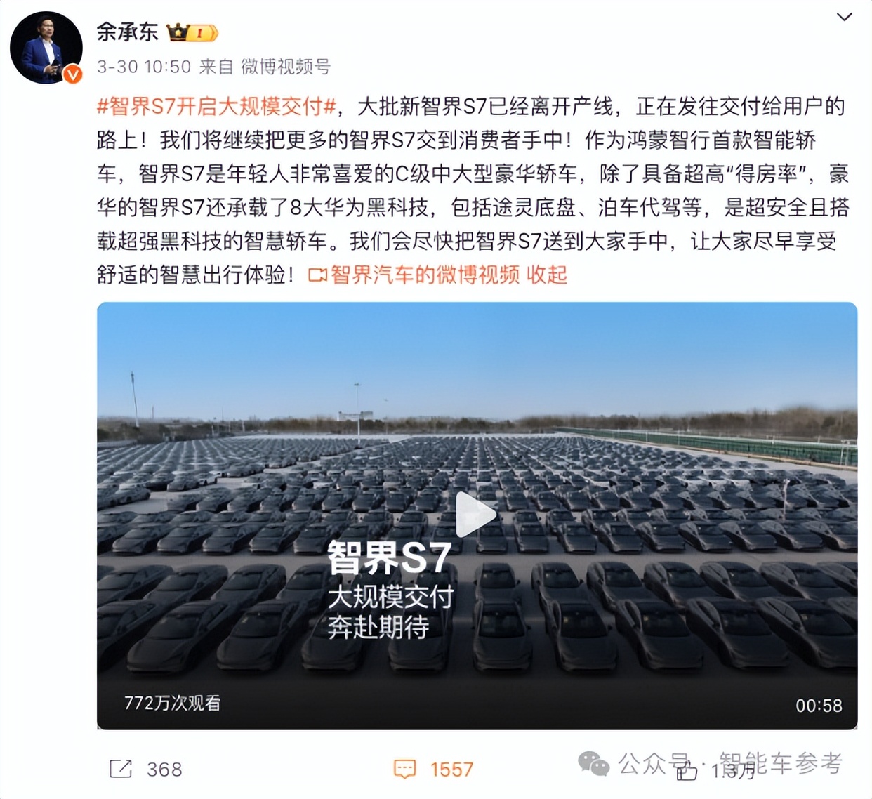 余承东前几天还在微博官宣,智界S7开启大规模交付。