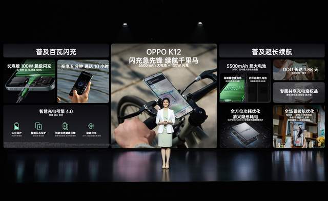 OPPO K系列的使命为 5 亿大众用户打造一部好手机,此次,OPPO K12较上代全面升阶,搭载长寿版100W超级闪充和5500mAh大容量电池的黄金充电续航组合,全面普及百瓦闪充和超长续航。