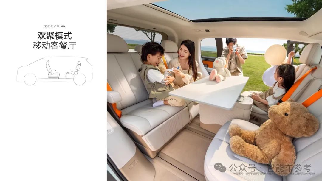 “宝宝巴士”极氪MIX的最大特点就是取消传统B柱,搭载贯通式电动对开门,并且主副驾座椅都可以电动旋转,最大旋转角度为270度,再加上近2米的前后排共用滑轨,让极氪MIX内部座舱能适用20种以上的使用场景。