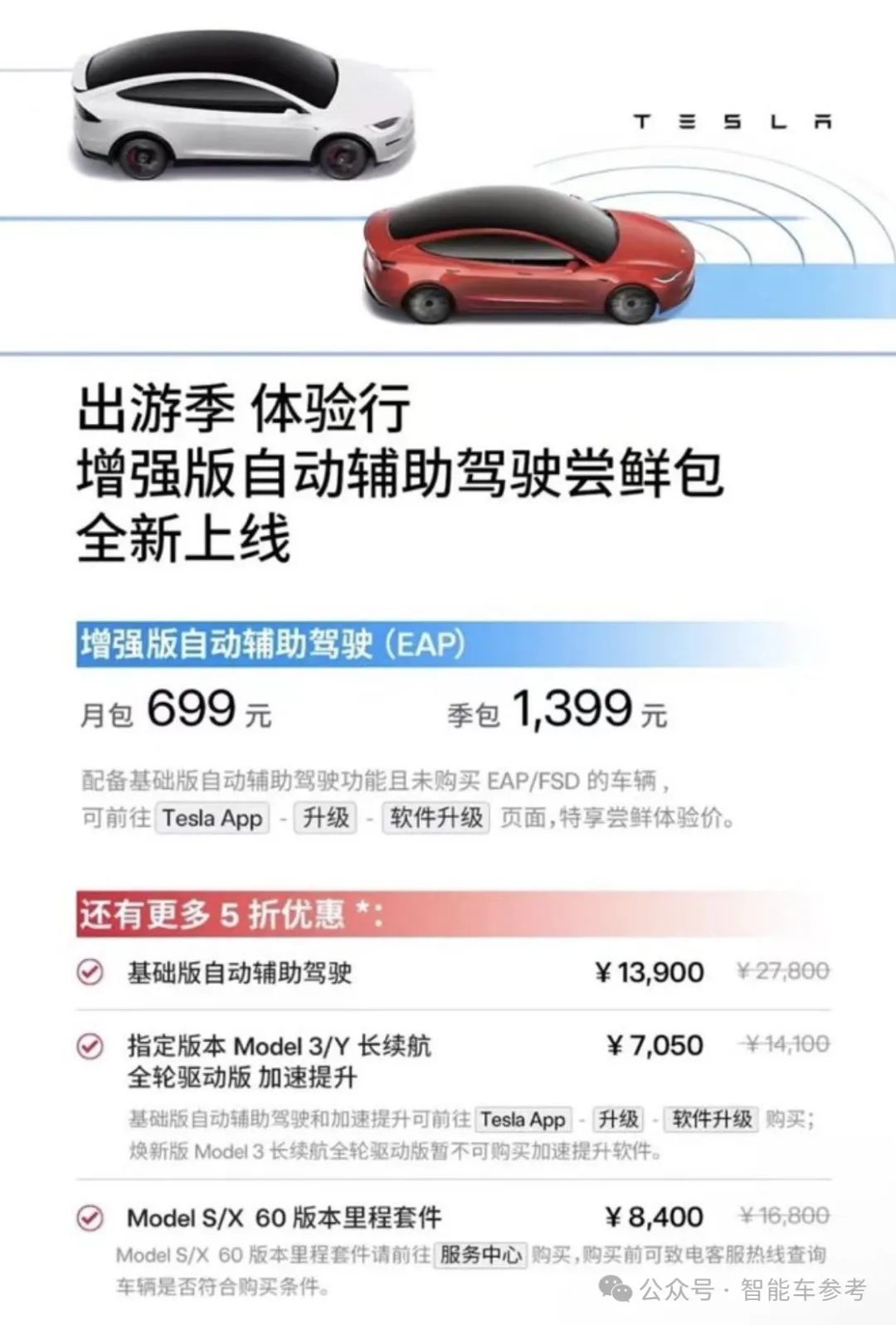 原本花3.2万一次性买断的增强版自动辅助驾驶(EAP),现在可以花699元订阅一个月,或者1399元订阅一个季度。