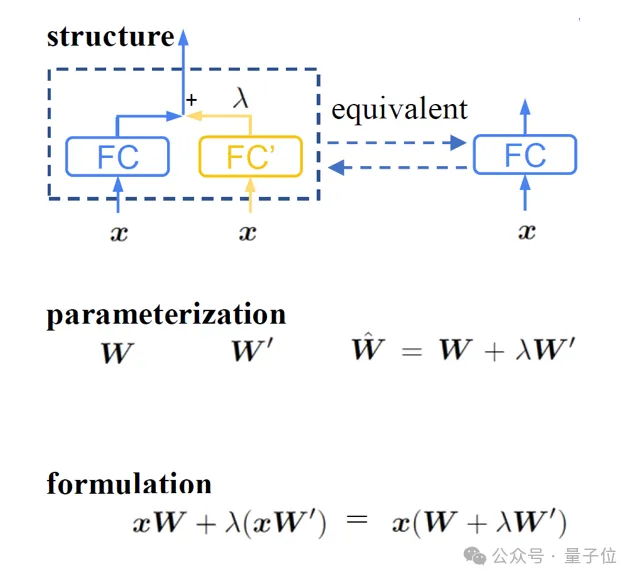 如图所示,比如有不同模态的两个线性层FC和FC’, 那么跨模态结构重参数化就是要通过构建一个运算完全等价的线性层来承载两个模态的运算,在这里直接将来自不同模态的两部分权重 (W和W’)做线性组合(W+λW’)来平衡两个模态的权重对于目标模态的贡献。