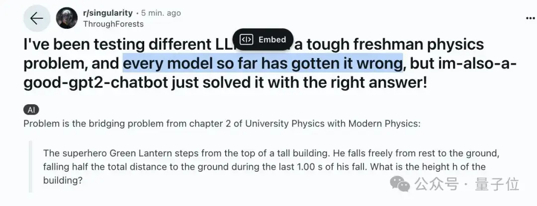 还有在解决物理题方面,有Reddit用户说im-also-a-good-gpt2-chatbot能解答出其他模型都答不对的物理题。