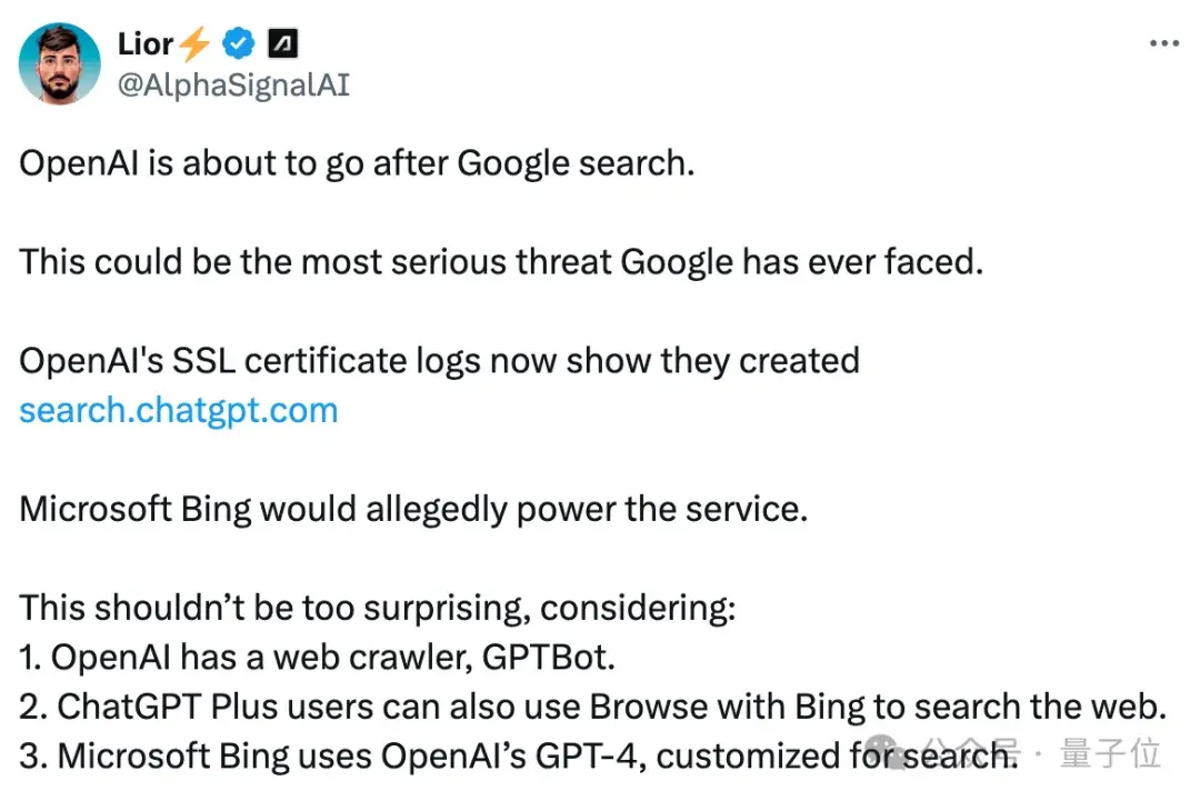 值得一提的是,最近有大V爆料称本周OpenAI将公布进军搜索引擎的消息。