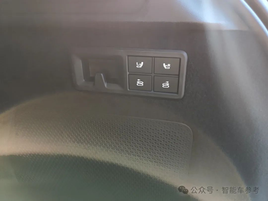 右侧是四个按键,上面两个调节后排左右座椅放倒,下面是一键放平: