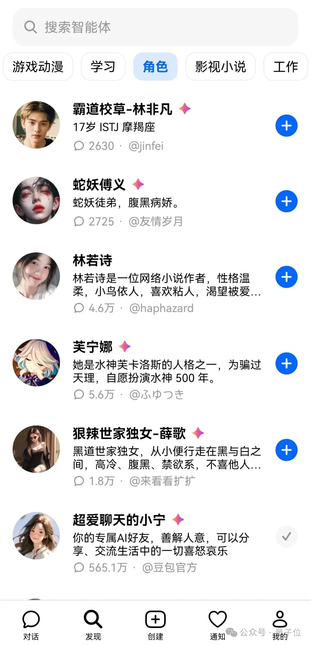 而诸如此类的智能体,豆包APP里可谓是数不胜数,比如霸道校草、狠辣世家独女、知心姐姐、财神……嗯,有点意思。