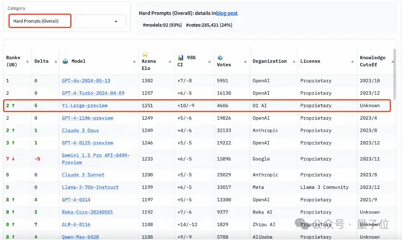 这个榜单上,Yi-Large处理艰难提示的能力与GPT-4-Turbo、GPT-4、Claude 3 Opus并列第二。