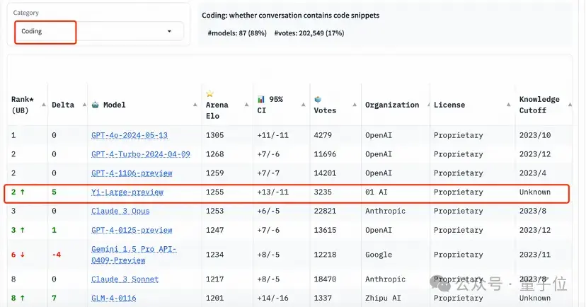 而在分类别的排行榜中,Yi-Large同样表现亮眼。