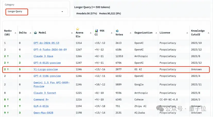 在长提问(Longer Query)榜单上,Yi-Large同样位列全球第二,与GPT-4-Turbo、GPT-4、Claude 3 Opus并列。