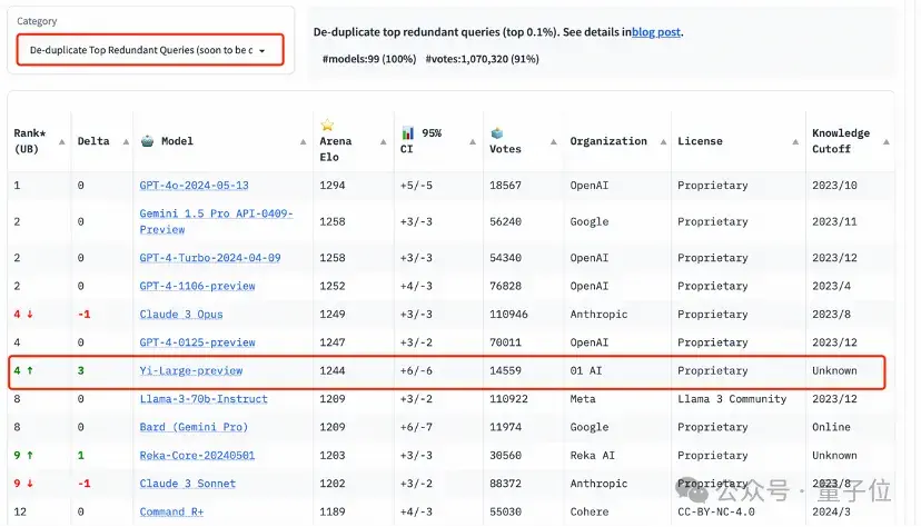目前,在去除冗余查询后的总榜中,Yi-Large的Elo得分更进一步,与Claude 3 Opus、GPT-4-0125-preview并列第四。