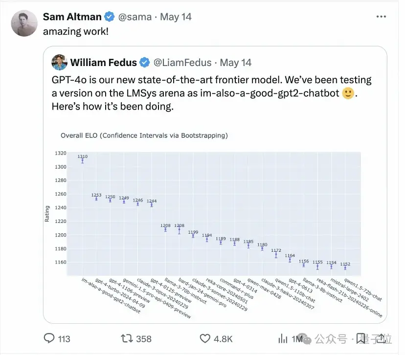 GPT-4o发布后,OpenAI的CEO奥特曼也转帖引用大模型竞技场盲测擂台的测试结果,直呼鹅妹子嘤。