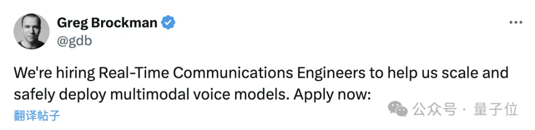 推文中,Brockman写到,OpenAI正在招募工程师扩大并安全推进多模态语音模型。