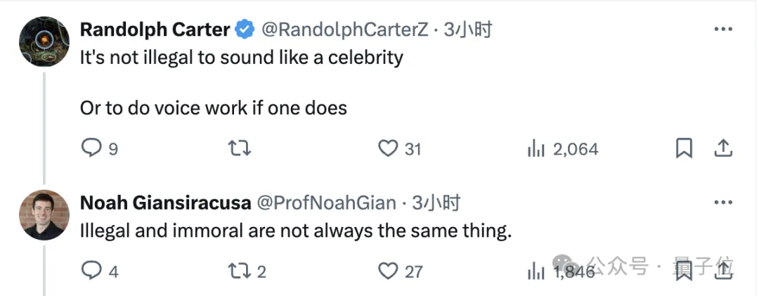 控诉一出,就引发了网友们的热议,本特利大学教授Noah Giansiracusa就表示,OpenAI使用和名人高度相似的声音,这种做法哪怕没违法,也是不道德的。