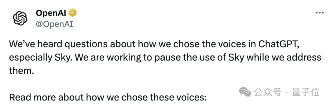 我们收到了关于ChatGPT中声音,特别是Sky的疑问,我们正在采取措施暂停Sky的使用,直到问题被厘清。