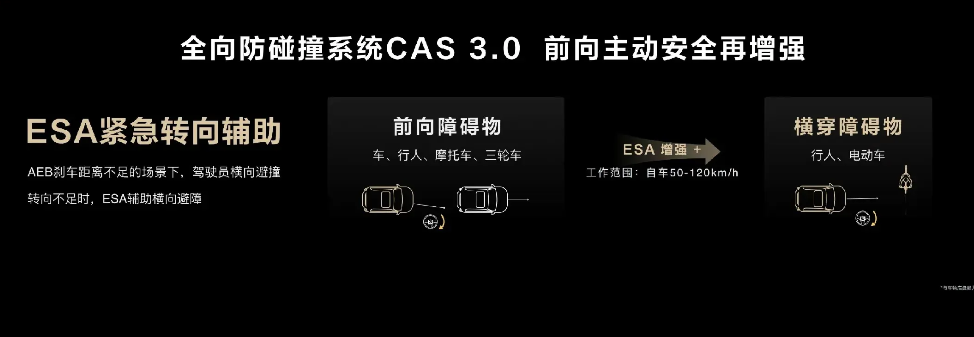 ESA紧急转向辅助功能可以在AEB刹车距离不足、驾驶员横向避让转向不足场景下,主动转向避让。还可以做到跨车道避让,避让横穿斜穿车辆、自行车、电动车等。