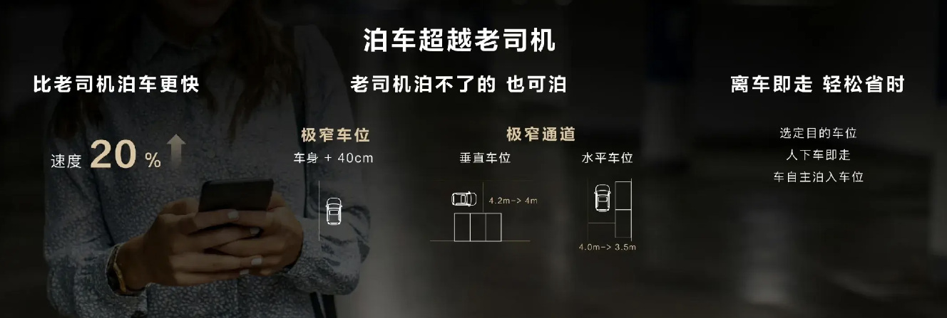 另一个能力升级是泊车能力,支持从车位到车位的导航,并且泊车速度提升20%、极窄车位、通道都能通过并泊入。