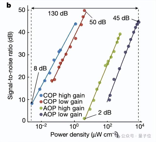 通过COP和AOP不同增益模式的动态范围叠加,“天眸芯”实现了130dB的整体动态范围。它能检测从2.71×10^-3 μW/cm^2到8.04×10^3 μW/cm^2的光功率密度。