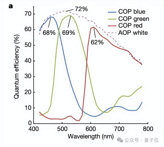“天眸芯”在COP和AOP两个路径上都展示了高量子效率,在530nm波长下,AOP的量子效率最大值达72%,而COP达到69%。