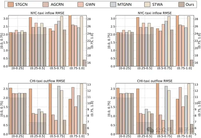 本部分对UrbanGPT在应对不同时空模式场景时的稳定性进行了评估。团队根据区域内在特定时间段数值波动的大小将区域进行区分。方差较小的区域代表时间模式较为恒定,而方差较大的区域则代表时空模式更为多变,例如繁忙的商业区或人口密集地区。图6的评估结果显示,大多数模型在方差较低、时空模式相对稳定的区域中表现较好。然而,基线模型在方差较高、特别是方差位于(0.75, 1.0]区间的区域中表现不佳,这可能是因为基线模型在推断未见区域的复杂时空模式方面存在局限。在实际的城市运营中,对人口密集或商业繁忙区域的准确预测对于城市管理极为关键,包括交通信号的控制和安全调度等方面。UrbanGPT在方差位于(0.75, 1.0]区间的区域中展现了显著的性能提升,这凸显了其在零样本预测方面的卓越能力。
