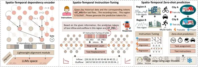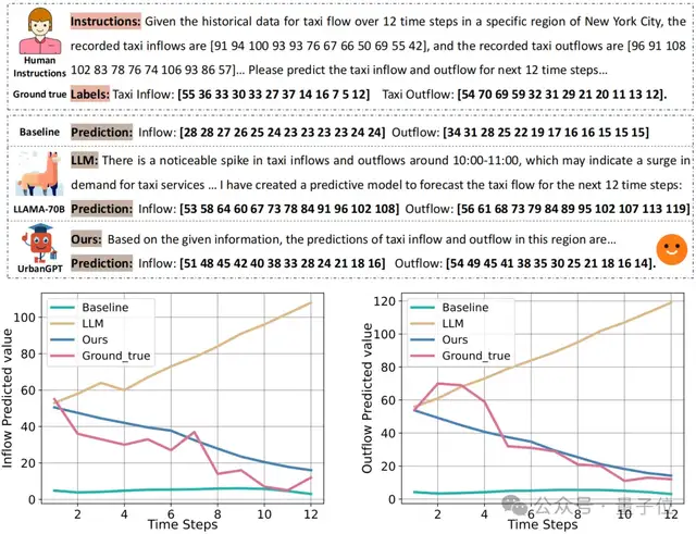 △ 图1:与LLMs和现有时空图神经网络相比,UrbanGPT 在零样本场景下能更好地预测未来时空趋势