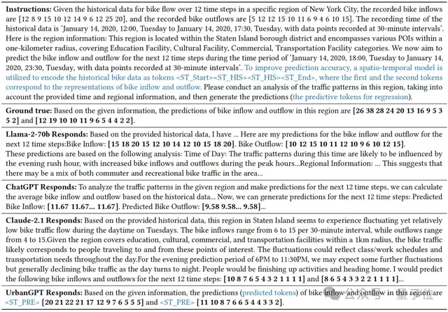 具体来看,ChatGPT在其预测中倾向于依赖历史平均值,而不是明确地整合时间或空间数据。Llama-2-70b能够分析特定时段和区域的信息,但在处理数值时间序列的依赖性时遇到了难题,这影响了其预测的准确性。相比之下,Claude-2.1能够高效地整合和分析历史数据,并利用高峰时段的模式以及兴趣点(POI)信息来提高流量趋势预测的精确度。在本研究中提出的UrbanGPT模型,通过时空指令微调的方式,成功地将时空上下文信号与大型语言模型的推理能力结合起来,显著提升了预测数值和时空趋势的准确性。这些发现凸显了UrbanGPT框架在捕捉普遍时空模式方面的潜力,证实了其在实现零样本时空预测方面的有效性。