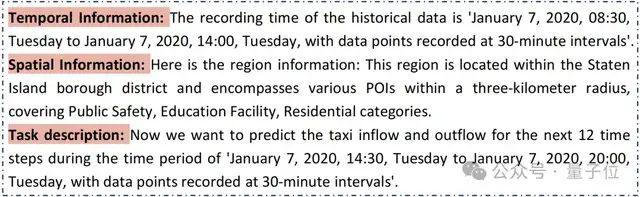 在进行时空预测时,时间与空间维度都蕴含着丰富的语义信息,这些信息对于模型准确理解特定情境下的时空动态至关重要。例如,早晨的交通流量特征与交通高峰时段显著不同,同时商业区和住宅区的交通模式也各有特点。UrbanGPT框架通过整合不同粒度的时间数据和空间特征,作为其大型语言模型的指令输入。具体来说,时间信息涵盖了日期、具体时间等要素,而空间信息则包括了城市名称、行政区划分以及周边的兴趣点(POI)等数据,如图3所示。这种多维度的时空信息整合,使得UrbanGPT能够精确地捕捉不同时间和地点的时空模式,显著增强了其在未知样本上的推理能力。