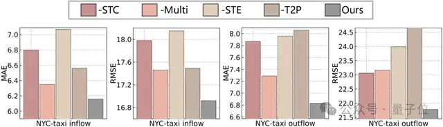 (3)时空编码器的作用:-STE。 缺少时空编码器显著限制了大型语言模型在时空预测任务中的效能。这突出了所设计时空编码器在增强模型预测准确性方面的重要性。