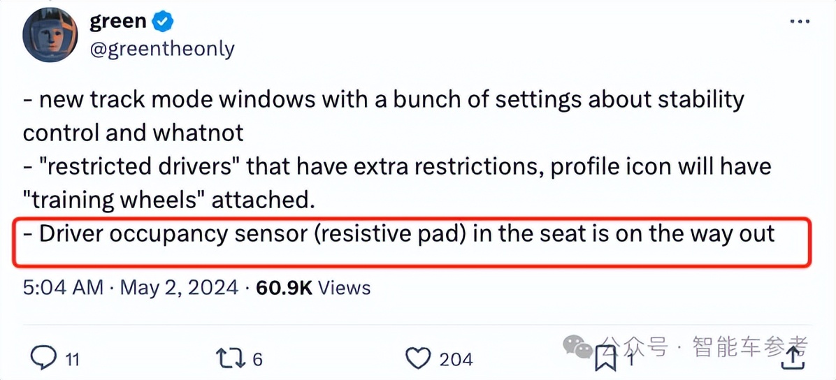 专注跟踪特斯拉动态的黑客“绿神”green,近日在社交平台爆料,他通过逆编译破解了特斯拉的软件更新数据,指出特斯拉将移除座位占用传感器。