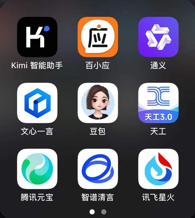 Kimi、百小应、通义千问、文心一言、豆包、讯飞星火、商量、智谱AI、腾讯元宝、天工。