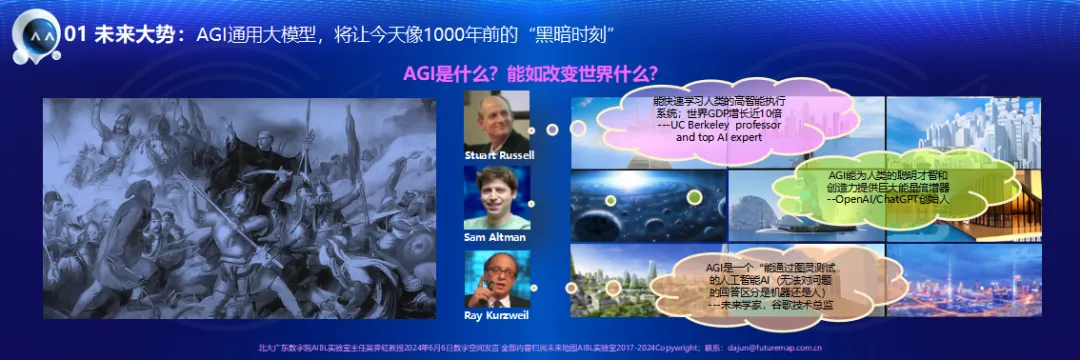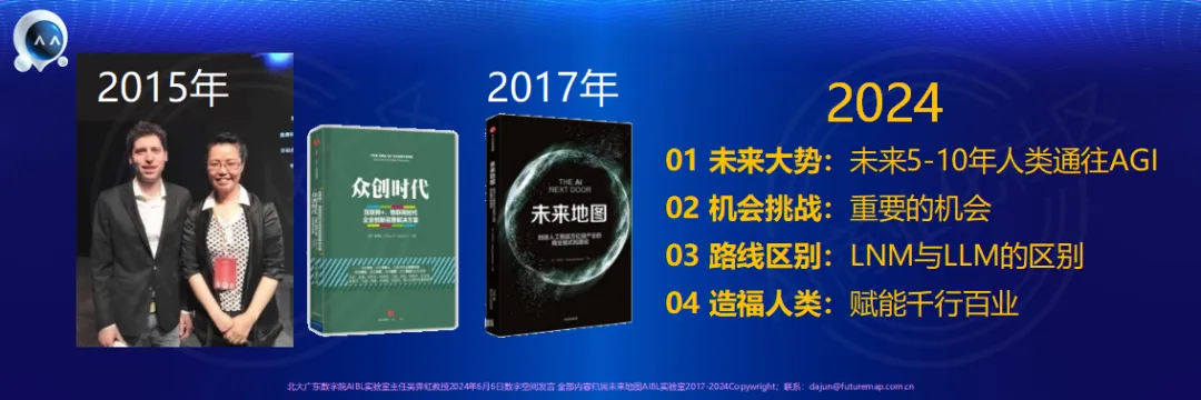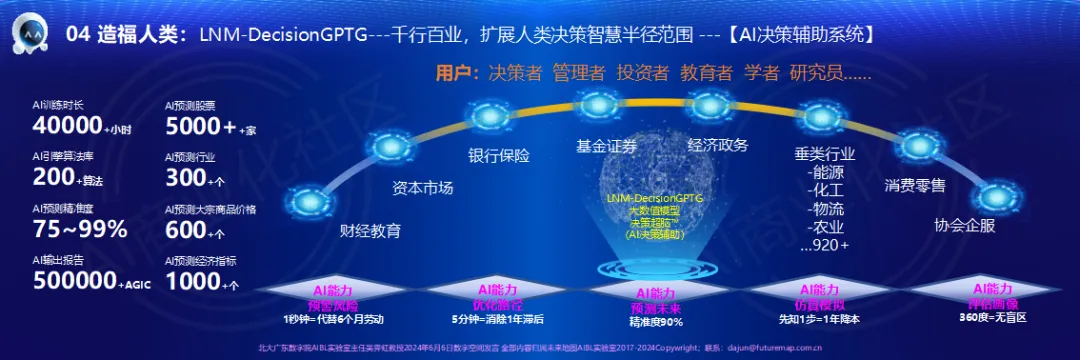 今天我很荣幸参加我们研究院的盛会,借胡润先生的吉日,也借童庆禧院士、陈清泉院士、王晋年院士、李鹰院长、以及京彩张先生数字空间的能量场和各位新老朋友支持,我和大家分享全球今天最火热的AGI话题,并分享填补世界空白的LNM-DecisionGPTG的研究成果。