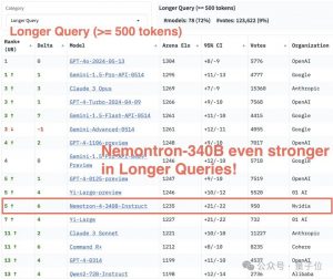 在长文本查询(长度>=500个token)中,Nemotron-4 340B排在第5位,超过Claude 3 Sonnet及Qwen 2-72B等主流开源模型。