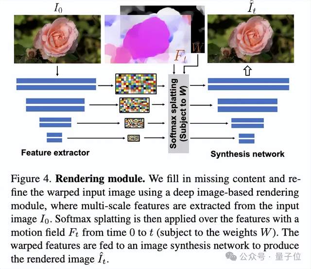 最后,将预测的谱体积通过逆傅里叶变换转化为运动纹理,并设计了一种基于图像的渲染模块,将输入图像按预测的运动轨迹进行前向渲染,最终生成展现自然振荡运动的动画视频序列。