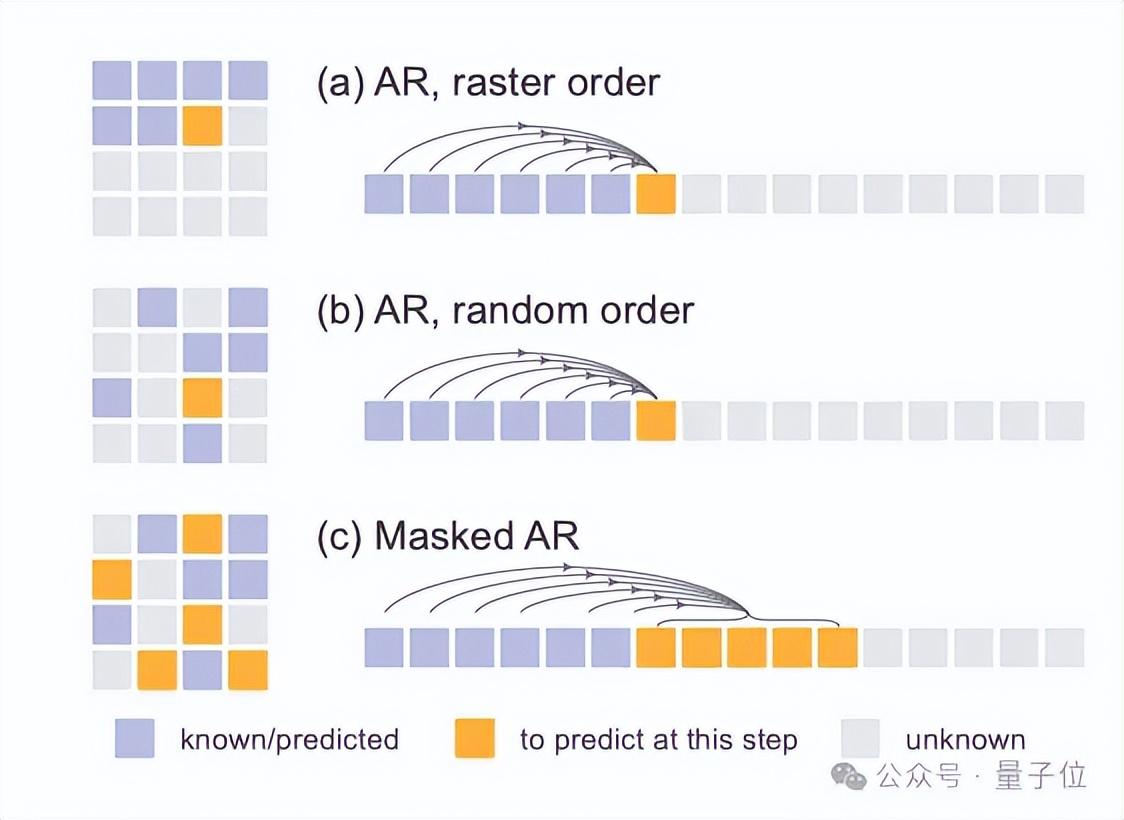 这篇工作的另一个亮点,是各种自回归模型的变体都适用。它统一了标准的自回归AR、随机顺序的AR、以及何恺明擅长的掩码方法。
