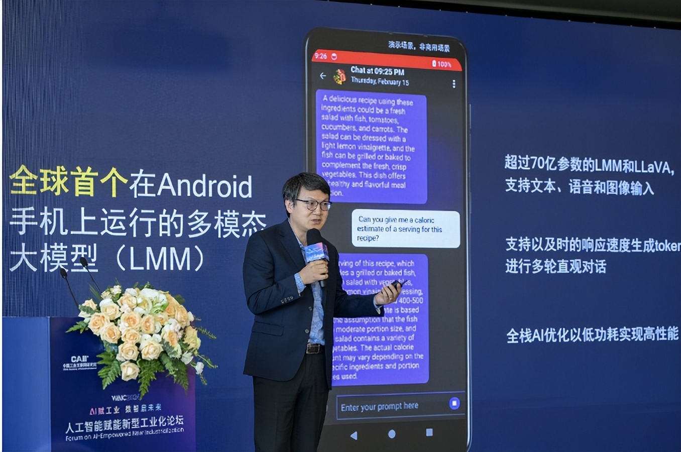 回顾生成式AI的发展,大语言模型(LLM)为纯文本训练模型带来了出色的能力,而能够支持文本、图片等不同信息形式的模型可以更全面地理解世界,多模态AI将成为终端侧生成式AI未来发展的关键技术范例。大会现场,基于第三代骁龙8移动平台的强大AI能力,高通带来了首个在Android智能手机上运行的大语言和视觉助理大模型(LLaVa)技术演示。具有语言理解和视觉理解能力的多模态大模型能够赋能诸多用例,例如识别和讨论复杂的视觉图案、物体和场景,并且增强了隐私、可靠性、个性化和成本优势。